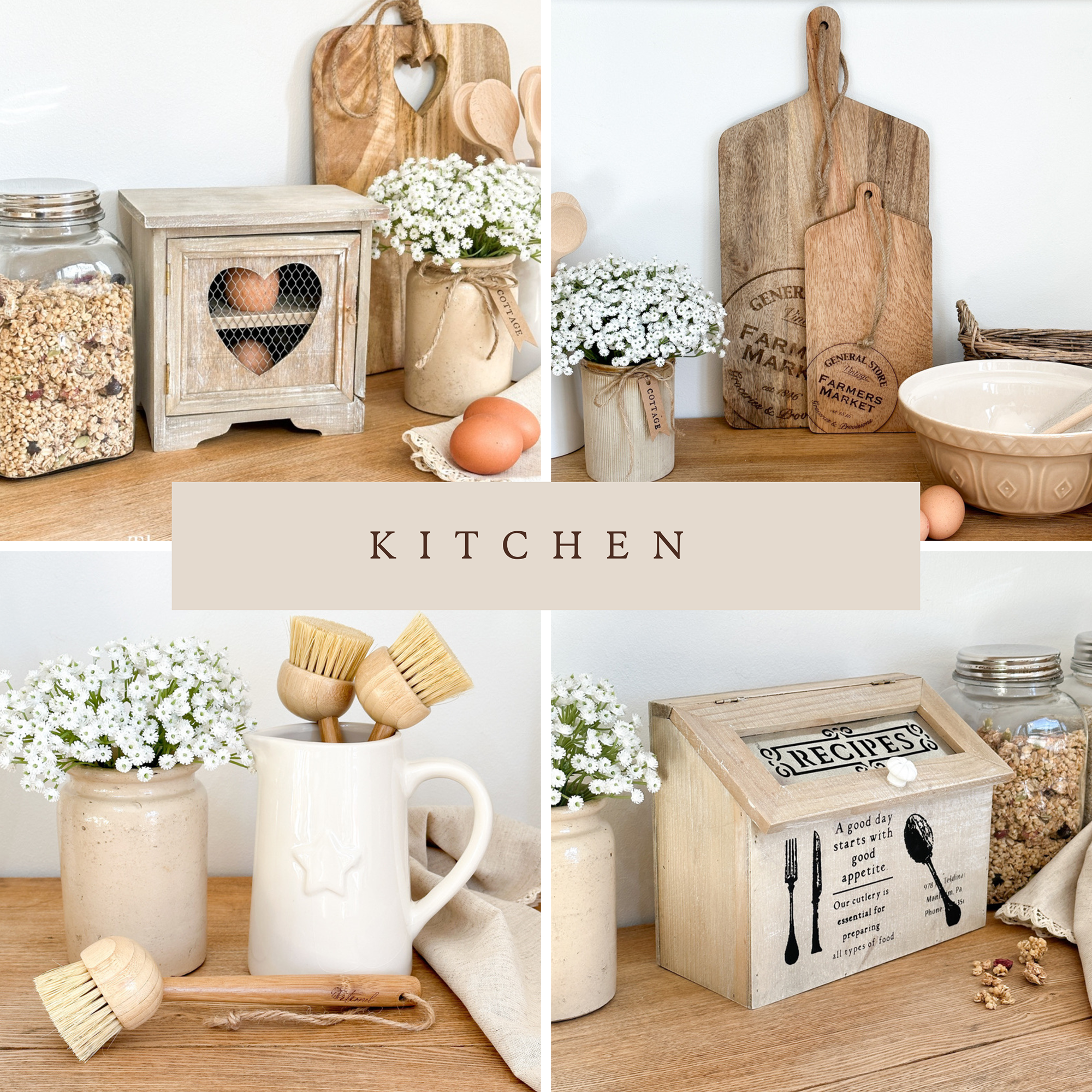 Our kitchen collection features charming country and farmhouse style additions. From wooden chopping boards and storage, to sweet decorative chickens and egg houses. Our kitchen is collection is for relaxed & informal living.